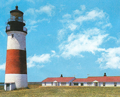 Sankaty Head Lighthouse as it appeared with the new duplex keepers’ homes. Claire and Joe Bauser lived in the section to the left. In the 1990s as erosion threatened the structures, one of the homes was moved from the site to another location to become low income housing. The rest of the buildings were demolished. In 2007 the lighthouse tower was moved 250 feet away from the eroding bluff. (Photo courtesy Claire Bauser.)