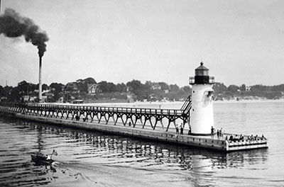 The South Haven Lighthouse is shown here in 1914 when it was painted white. The official name of the lighthouse is the South Haven South Pierhead Light. When it was constructed in 1903, part of the tower came from a discontinued lighthouse that once stood in Muskegon, Michigan. A story in The Daily Tribune dated October 14, 1903 stated, “The tower is to be of all new steel, but the cast iron steel ring on which the cupola will stand was brought from Muskegon, where it did duty for forty years on the lighthouse.” (Lighthouse Digest archives.) Back to the edition of: Sep/Oct 2018
