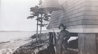 Carl Holt, son of keeper Allen C. Holt, standing underneath the fog bell at the bell tower of Deer Island Thorofare Lighthouse. (Courtesy Mike Gross.) Back to the edition of: Jul/Aug 2019