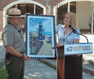 In 2009, the Tortugas Harbor Lighthouse was featured on a United States postage stamp. Shown here is Dan Kimball, Superintendent of the Everglades and Dry Tortugas National Parks, along with Jane Evans, postmaster of the Key West Post Office, holding up a poster depicting the new postage stamp. (Lighthouse Digest archives) Back to the edition of: Jan/Feb 2021