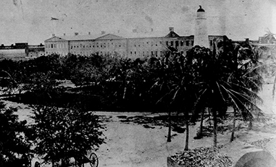 This rare photo shows the first Tortugas Harbor Lighthouse that was originally known as the Garden Key Lighthouse. Built in 1825, the tower was heavily damaged by a hurricane in 1873 and subsequently demolished. (Lighthouse Digest archives) Back to the edition of: Jan/Feb 2021