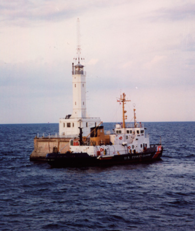 Undated photo of the U.S. Coast Guard Cutter Key Biscayne servicing the Gray’s Reef Lighthouse. Notice that the radio beacon antenna is still in place above the lantern room. The Coast Guard Cutter Key Biscayne was decommissioned in 2012. (Lighthouse Digest archives photo) Back to the edition of: Jul/Aug 2013