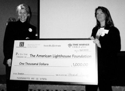 Holly Dalton of A&E Networks History Channel presents a $1000 check to Kathleen Finnegan, treasurer of The American Lighthouse Foundation at the World Premiere of the History Channels Save Our History-American Lighthouses. Back to the edition of: June 2002
