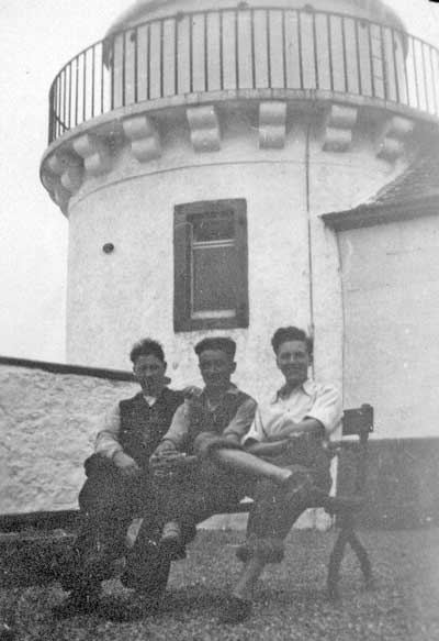 According to Peter McLean: “Mr. McQueen, on the left, was one of the keepers and was noted for his ability to sail a motorboat under any weather or inebriate condition. I speak from experience. Various times he had to abandon “ship” and swim for the shore after a wee visit to Millport, when the weather was a bit rough. However, it was also noted that he always found time (and presence of mind) to wrap his wallet etc. in oilskin before striking out for the shore. Donald, in the center, was a crewmember of the supply ship that did the rounds of all the Clyde Trust lighthouses. Stan, on the right, was a pal of mine, over on holiday. We were both keen, young athletes then and would run from one side of the island to the other.”