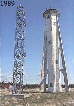 Notes: This lighthouse was replaced by a nearby steel tower in 1980. The dwelling was removed by 1989. Description of Tower: White pyramidal concrete tower with flying buttresses; the lantern has been removed.