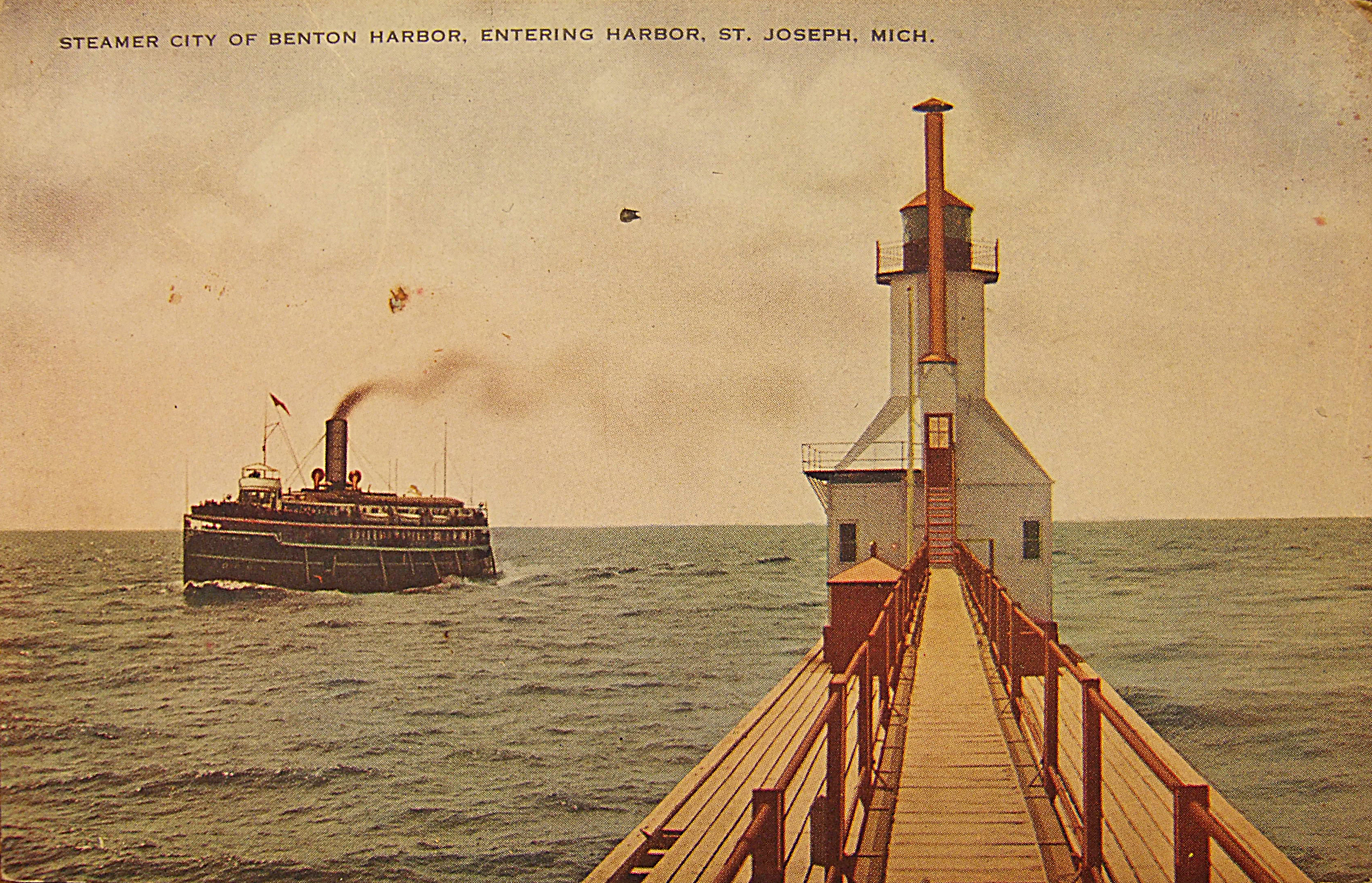 Vintage post card image of the St. Joseph North Pier Inner Light (rear range) looking west from the wooden catwalk and pier. The steamer City of Benton Harbor is shown entering the harbor. Walking on the pier was much too dangerous in inclement weather with crashing waves and freezing ice. The walkway was built to provide the keeper with safe passage to and from the lighthouse. (Image from the collection of Wayne Sapulski.) Back to the edition of: November 2009