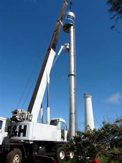 The open-air lantern room is hoisted into place atop the new Kauhola Point Lighthouse. (Photograph courtesy BMCS Dave Garrett, USCG.)