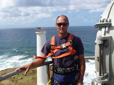 Chief Steve Tanaka, USCG at the top of the new Kauhola Point Lighthouse with the old tower behind him. This image also shows how large the new light, shown partially to the right, is. (Photograph courtesy Chief Steve Tanaka, USCG.) Back to the edition of: December 2009