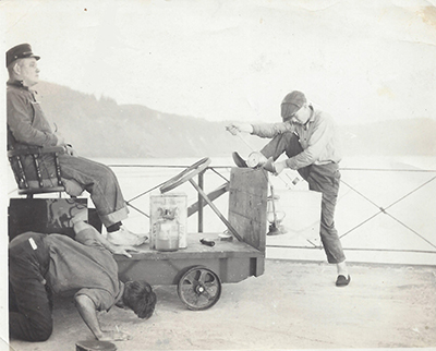 Orlo Hayward sits looking disinterested in the transport cart that has been rigged to resemble a car while Walter Lawrence (l) and Howard Hansen (r) give it the “pit-stop” treatment. Notice the kitchen chair as the driver seat, the kerosene crate holding up the “steering wheel” with some kerosene next to it to represent gas, a lantern for the headlight, a clock for the speedometer, and Hansen working on the supposed engine with a large hand tool. Robert Gerlof, in his letter to Orlo Hayward seven years later, recollects the fun they had with the car on “Broadway” at Tillamook. (Courtesy of Jean Hayward Wilkinson.)