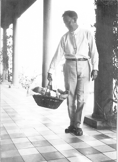 Frederick Dillon Sr. proudly shows off his youngest son, Fred Dillon Jr., on the veranda of their San Juan Lighthouse Depot home in 1923. Of him, Frederick wrote, “Baby Fredito, Jr. was an energetic, restless, little scamp who kept his nurse busy caring for him to see that he did not throw his expensive shoes in the water just to see them splash as he was taken out in his Go-Cart along the marginal wharf.” Fredito grew up to serve in WW II and saw action in the Battle of the Bulge and worked for United Airlines for 43 years. (Photo courtesy of Frederick P. Dillion III)