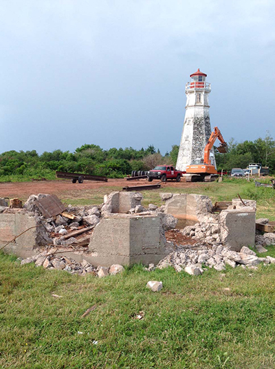 Ruins of the old foundation showing the Cape Jourimain Lighthouse now atop a new foundation at its new location. Back to the edition of: Sep/Oct 2016