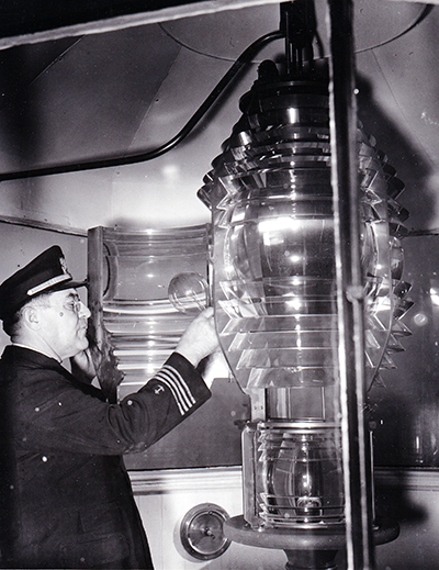 Captain Ernest Bondy USCG on January 4, 1937 is shown changing the light bulb that lighted the Fresnel lens of Michigan’s no longer standing Belle Isle Lighthouse. This photo shows that the lens was still in possession of the Coast Guard before they ordered that the lighthouse was to be demolished in 1943. (Lighthouse Digest archives.) Back to the edition of: Nov/Dec 2016