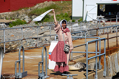 Sally Snowman waving a handkerchief, as she always does, as she greets visitors arriving to the island. Back to the edition of: Nov/Dec 2016