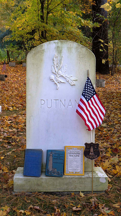 George Rockwell Putnam’s tombstone with the newly placed United States Light House Service marker with two books that he had written, Lighthouses and Lightships of the United States, published in 1917 and 1933 and Sentinels of the Coast, published in 1937, along with a copy of the August, 1936 edition of National Geographic in which he wrote an extensive article titled, “New Safeguards for Ships in Fog and Storm.” (photo by Ron Janard) Back to the edition of: Nov/Dec 2016