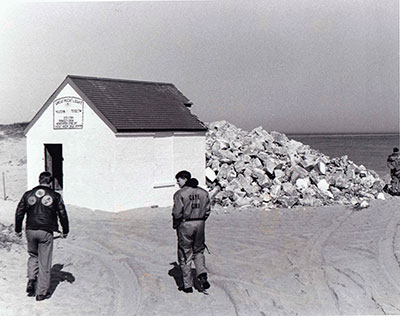 Coast Guardsmen and others view the rubble of the destroyed Great Point Lighthouse in March of 1984. (U. S. Coast Guard photo, Lighthouse Digest archives.) Back to the edition of: May/Jun 2017