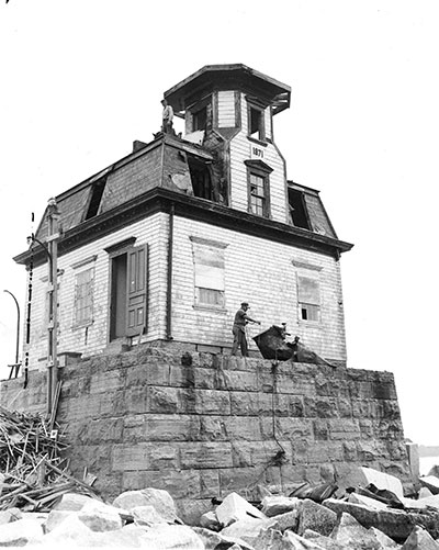 The dismantling of the Colchester Reef Lighthouse to be reassembled on the mainland. (Courtesy Shelburne Museum.) Back to the edition of: May/Jun 2017