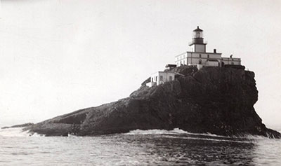 Appearing like an impregnable fortress upon the rock with no visible means of access, this very rare view of derrick-less Tillamook Rock Lighthouse was taken only six days after the horrific 1934 October storm that swept away the entire derrick and boom assembly into the sea. The photo was taken by 17th District Assistant Superintendent E.C. Merrill, who arrived for an inspection visit on the Tender Manzanita to assess the storm damage and debrief the keepers about their experiences during the storm. His subsequent report was used for the write-up of the storm that was recounted in the 1934 November issue of the Lighthouse Service Bulletin. (Courtesy Coast Guard Historian.)