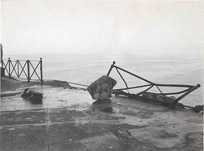 A sobering view of the destroyed cast iron railing that looked like it was ready to topple over the cliff edge to join those missing sections that already had succumbed. One of the 60 pound boulders that did the damage sits innocently by, while a lone pulley left from the derrick assembly is a grim reminder of what forces were unleashed at the height of the cyclone on the night of the 21st of October, 1934. (Courtesy Coast Guard Historian.) Back to the edition of: Jul/Aug 2017