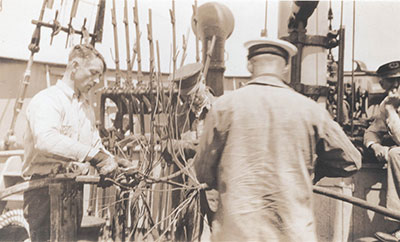 The submarine telephone cable from Tillamook Rock Lighthouse to the mainland that perished in the storm was only three years old. This photo shows workmen aboard the Tender Rose splicing the cable together while laying it in June, 1931. There were at least two cables laid and destroyed due to storm damage between 1920 to 1934, so after this point, rather than spending money to replace it yet again, it was recommended by E. C. Merrill in his report that radiotelephone equipment be utilized instead. (Courtesy Columbia River Maritime Museum.) Back to the edition of: Jul/Aug 2017