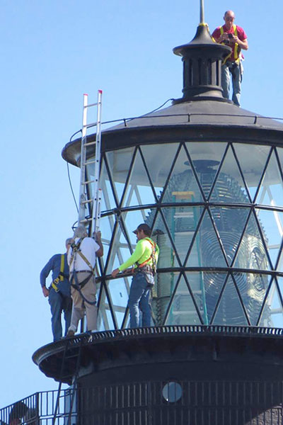 Work crew at the very first stages of preparing the roof of the lantern of the Jupiter Inlet Lighthouse for restoration in April of 2017. (Photo courtesy of the Jupiter Inlet and Museum.) Back to the edition of: Jul/Aug 2017