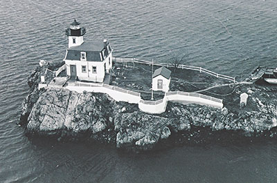 This 1950s aerial view of Pomham Rocks Lighthouse shows the skeleton light tower sitting on the foundation where the fog bell once stood. (Lighthouse Digest archives.) Back to the edition of: Mar/Apr 2018