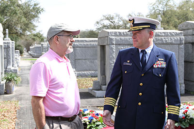 Captain Wayne R. Arguin Jr, Captain of the Port and Commander of Sector New Orleans, shares some thoughts with Henry Gonzales, Vice-President of the Board of the U.S. Lighthouse Society before the ceremony began. Several members of the Board and other lighthouse presenters from the National Heritage Maritime Conference were in attendance at the ceremony. Back to the edition of: May/Jun 2018