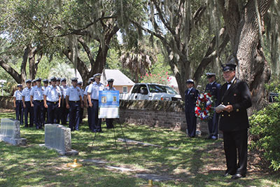 Ted Panayotoff, lighthouse director for the Friends of Hunting Island in his replica lighthouse keeper’s uniform making remarks as the Coast Guard detachment stands at attention. Back to the edition of: Nov/Dec 2018