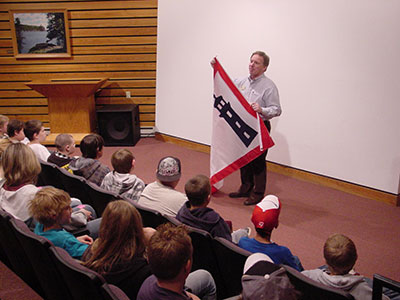 Lee Radzak, holding a replica of the U.S. Lighthouse Service pennant, giving students a lighthouse history lesson. (Courtesy Minnesota Historical Society.) Back to the edition of: Mar/Apr 2019