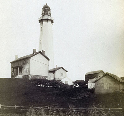 Completed in 1796, the Montauk Lighthouse at the east end of Long Island, New York was raised by 14 feet in 1860. The tower was painted all white at this time. The reddish brown band that you see on the tower today was added to the lighthouse in 1899. (Lighthouse Digest archives.) Back to the edition of: Mar/Apr 2019