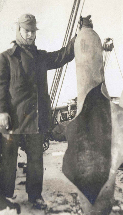 A crewman from the U.S. Lighthouse Service lighthouse tender Pansy is shown holding up one of the acetylene tanks that had ripped open in the 1923 explosion that destroyed the Fuller Rock Lighthouse. (Lighthouse Digest archives.) Back to the edition of: Mar/Apr 2019