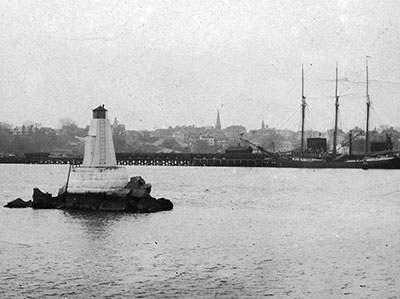 The Sassafras Point Lighthouse was a twin to the Fuller Rock Lighthouse. In 1912 when the Providence River in Providence, Rhode Island was widened, the lighthouse was demolished. Notice the three masted schooner. (Lighthouse Digest archives.) Back to the edition of: Mar/Apr 2019