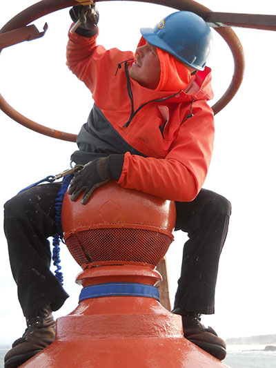 Darren Jones of Scott Partney Construction is sitting atop the Cape Arago Lighthouse ventilator ball surrounded by a steel frame to support the shrink wrap enclosure to be used during restoration. Back to the edition of: Mar/Apr 2019