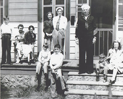 Shown on the porch at the far left are (l-r) Kenneth John, who was born at Bolivar Point Lighthouse on March 23, 1931; Eris Elizabeth, who was born at Cape St. George Lighthouse on July 16, 1922; wife Florence Mary; and Mary Magdalen, who is standing in front of the door by Louis Buras, Jr., who is wearing the hat. Sitting on the porch from left to right are Huey Pierce who was born at the Tchefuncte River Rear Range Light Lighthouse on December 15, 1935; Vance Vernon, who was born at Bolivar Point Lighthouse on February 18, 1933; Harold Paul, who was born on June 18, 1940 at the Pensacola Lighthouse; and Gloria Catherine, who was born on July 20, 1926.
