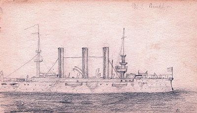 Ida Littlefield’s Sketchbook: Out of the 40 drawings in Ida’s sketchbook, 14 of them were devoted to different types of ships that she saw in the harbor nearby. Shown are the famous USS Oregon and USS Brooklyn on a visit to the New York Naval Yard in-between conflicts of the Spanish-American War during the summer of 1898. (Courtesy of Brent Dubach and Judy Sheckler)