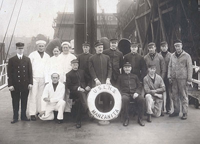 This circa 1915 image shows the crew of the tender Manzanita. Capt. Charles Richardson sits at left next to the life buoy with Chief Engineer Brown sitting on the other side. Among the group of officers standing directly behind them is Carl L. Hagen (left), who would later command the tenders Fern and Rose; Charles A.A. Modeer, with his hands on the ring buoy, who would captain the Manzanita for almost 20 years, and Axel E. Anderson on the far right. (Courtesy Clatsop County Historical Society)