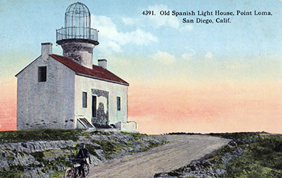 Vintage post card of a man posing with his motorized bike by the abandoned Old Point Loma Lighthouse. The lighthouse was often referred to by post card companies and others as the “Old Spanish Lighthouse.” (Lighthouse Digest archives.) Back to the edition of: Mar/Apr 2019
