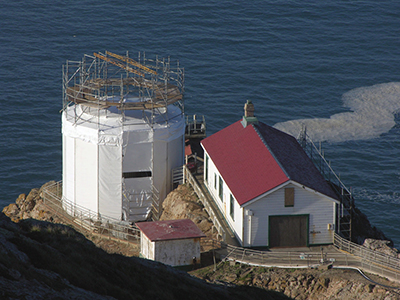 The Point Reyes Lighthouse tower, minus its lantern, is all wrapped up as full restoration of the tower is undertaken. Back to the edition of: May/Jun 2019