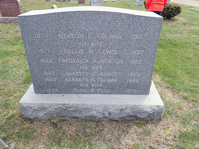 The Tolman family headstone monument at the Forest Hill Cemetery in South Portland, Maine for lighthouse keeper Merton E. Tolman and his wife Nellie; Merton’s “adopted parents” Frederick A. and Laurette C. Abbott Norton (Pa and Ma Norton); and Merton and Nellie’s son, Kenneth H. Tolman and his wife Olive. Back to the edition of: May/Jun 2019