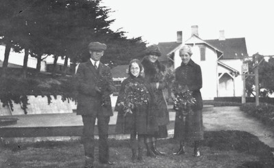This photo of George Watters (l), Dorothy Watters (m), and Della Watters (r) at the Point San Luis Light station was taken in January of 1923. The woman in the hat is identified only as “Mrs. Philbrick.” The group, holding holiday greenery, is standing in front of two cisterns that supplied water to the station. Behind the cisterns is the Victorian duplex where the two assistant keepers lived. Back to the edition of: May/Jun 2019