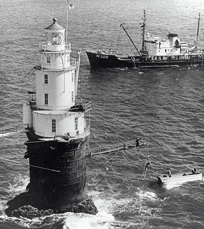 A Coastguardsman climbing the Jacob’s ladder at Mile Rocks Lighthouse in California. Back to the edition of: Jul/Aug 2019