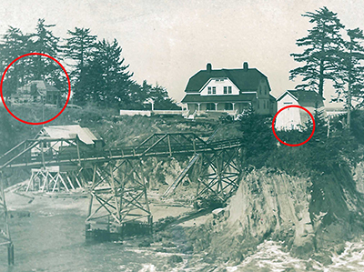 The construction of the high bridge at Cape Arago Lighthouse was finished within a month of Thomas C. Wyman’s accident, after which time, the cable tramway was no longer used. The tramway box is shown in front of the former winch house (right circle) while the second lighthouse is still being constructed (left circle) in this 1908 photo. (Courtesy of Greg Kandoll) Back to the edition of: Sep/Oct 2019