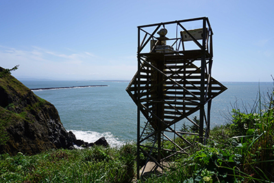 The Columbia River Entrance Range Front Light is situated on the service road at the crest of the hill about three hundred feet behind the Cape Disappointment Lighthouse. It helps guide ships through the channel in-between the jetties that frame the entrance to the Columbia River. Jetty A is clearly seen extending out on the left of the photo.