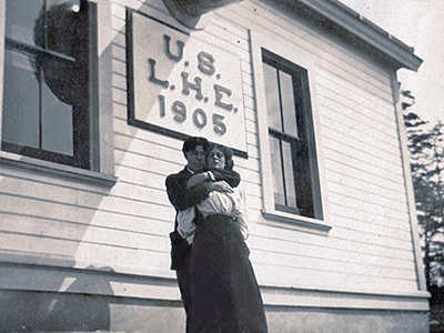 It isn’t too often that we see photos of keepers at any lighthouse in such a romantic embrace. Here, assistant keeper Ann Thomas is wrapped in the arms of her new husband, Homer Haynes, in front of the fog signal lighthouse building in 1909. Notice the sign with the construction date of 1905 behind them and the letters signifying the United States Light House Establishment. Back to the edition of: Jan/Feb 2020
