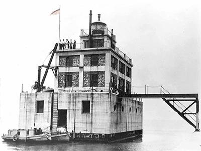 Although the year of 1923 was written on the back of this photo of the Indiana Harbor East Breakwater Lighthouse in East Chicago, Indiana, the year may not be correct. The image shows three women in long dresses and two men standing on the second exterior deck of the lighthouse. The flag is proudly waving in the wind and the curtains are closed in the lantern, indicating that the Fresnel lens was in place. The boat tied to the crib of the structure has the lettering USLHS 138, indicating that the boat belonged to the United States Light House Service. (Lighthouse Digest archives.)