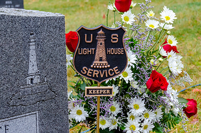 Close-up view of the U.S. Lighthouse Service Memorial Marker at George Keller’s gravestone. The gravestone has an engraving of White Shoal Lighthouse on it. (Photo courtesy Jill Ore) Back to the edition of: Jan/Feb 2021