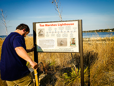 Daniel Howard, a York County employee, putting the finishing touches on the installation of the Tue Marshes Lighthouse sign. Back to the edition of: Jan/Feb 2022
