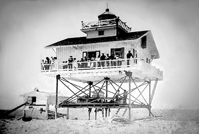 Daniel and Elizabeth McCall were transferred to Cat Island, Mississippi in 1899. The second lighthouse, a screwpile built in 1871, was somewhat of a tourist destination as is shown by this 1884 photo. After being given leave to bury her husband, Elizabeth returned to the island a few weeks later and was formally given the appointment of keeper for two months, from July 11 to September 21, 1904 while she waited for a permanent home to be built for her in nearby Gulfport. Her niece and nephew were with her to help her keep the light on Cat Island during that time. After moving to Gulfport, she wrote a book about her life, from which the excerpts in this article were taken. (National Archives)
