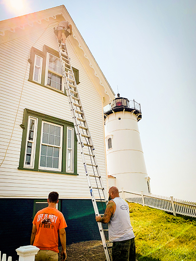 The crew from J.B. Leslie Company installed the Christmas lighting on the tower and house at Nubble Lighthouse in York, Maine. (Courtesy Matt Rosenberg, Town of York)