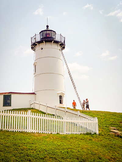 The crew from J.B. Leslie Company installed the Christmas lighting on the tower and house at Nubble Lighthouse in York, Maine. (Courtesy Matt Rosenberg, Town of York) Back to the edition of: Jan/Feb 2022
