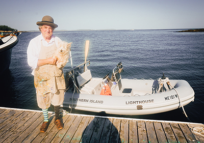 Jamie Wyeth had his iceberg misadventure in a Zodiac similar to this hard-bottom inflatable in the early 1990s. He is holding his 12-year-old west highland terrier, Iggy, the Tenants Harbor “Station Dog.” Back to the edition of: Jan/Feb 2022